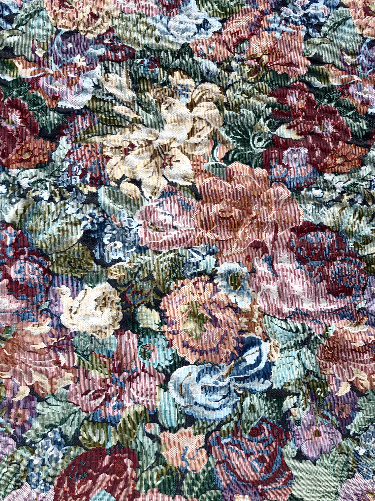 Elegantní čalounická látka s květy. Silná a pevná textilie, kterou můžete směle použít i k ušití například zateplovacího závěsu proti chladu u vstupu.