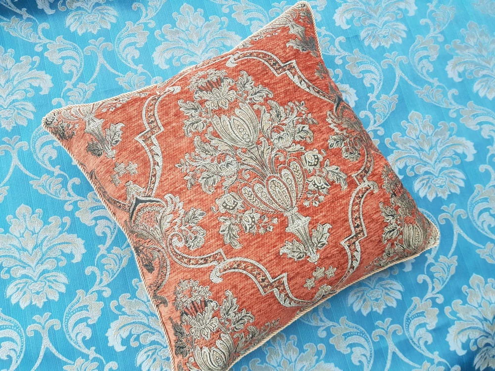 Elegantní polštářový povlak s barokními motivy. Vzor je vytkávaný, podkladový materiál je žinylka.
