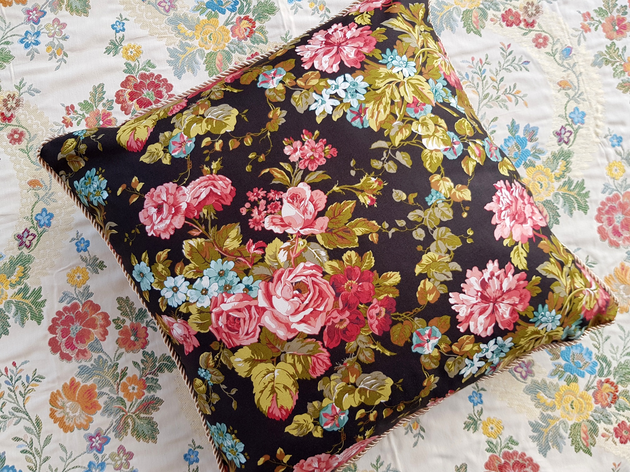 Květinový polštářový povlak lemovaný kroucenou šňůrou. Ve spodní části zakončeno zipem.